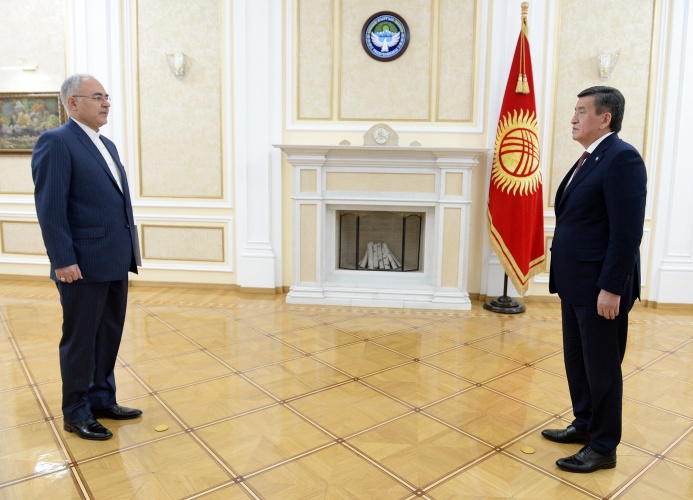 تقدیم استوارنامه جناب آقای خرازی سفیر جمهوری اسلامی ایران به سورنبای جئین بکوف رئیس جمهور قرقیزستان