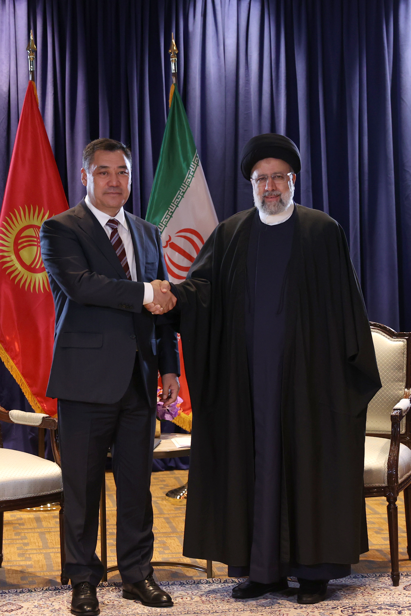 آیت الله سید ابراهیم رئیسی رئیس جمهوری اسلامی ایران و صادیر جاپارف رئیس جمهور قرقیزستان در حاشیه نشست سالانه مجمع عمومی سازمان ملل در نیویورک با یکدیگر دیدار و در خصوص مناسبات سیاسی ، اقتصادی و فرهنگی بین دو کشور مذاکره و تبادل نظر نمودند.