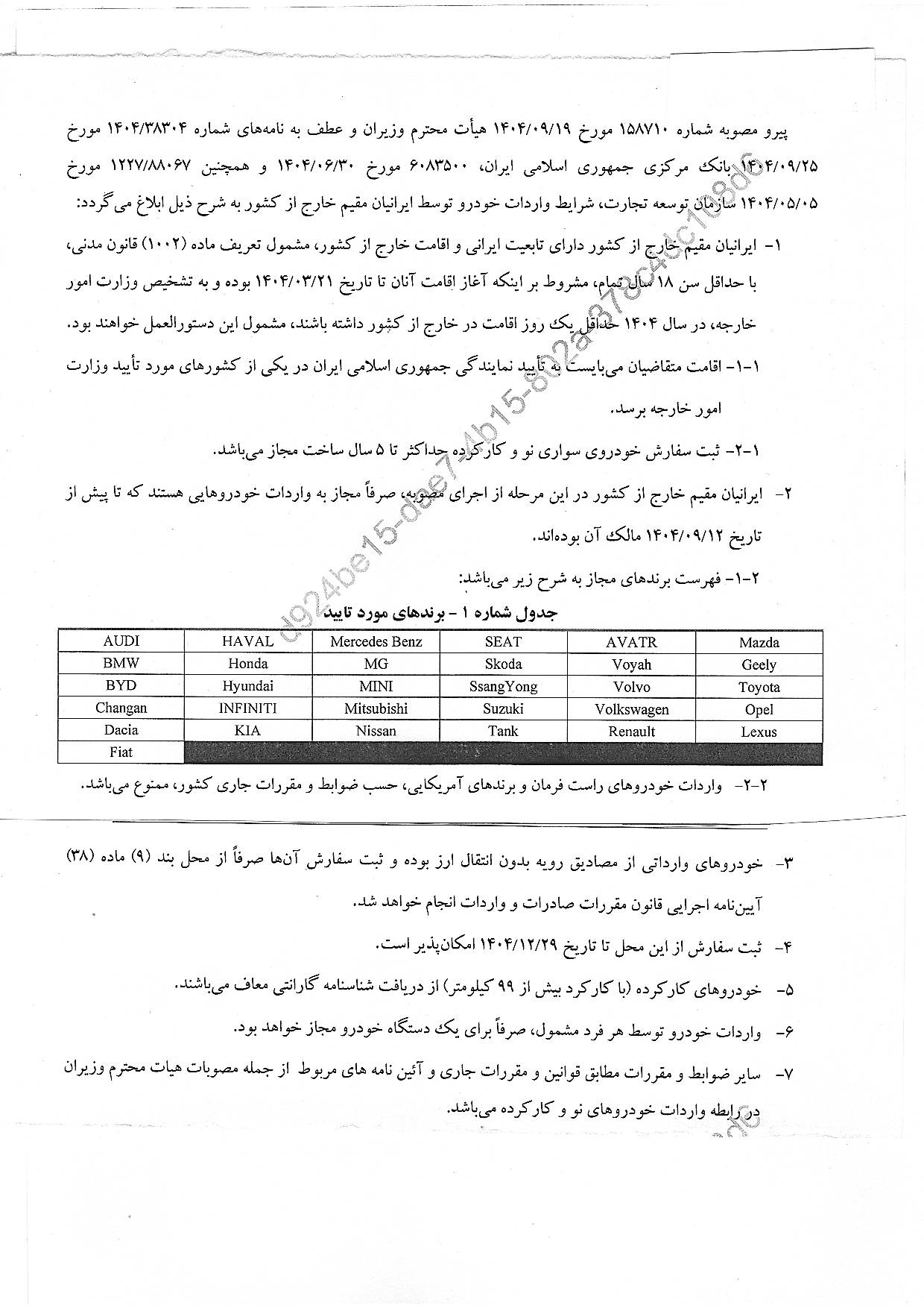 2- ایرانیان خارج از کشور در این مرحله از اجرای مصوبه صرفاً می‌توانند نسبت به واردات خودروهایی که تاپیش از تاریخ : 12 / 09 / 1404 مالک آن بودند ، اقدام نمایند .
